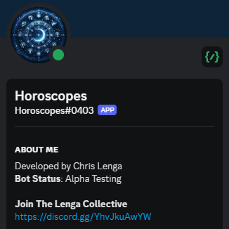 DeprecatedThis bot would post horoscopes in pre-defined channels each morning based on admin-configured settings. Originally the project started out as a custom integration for a client, but after multiple requests from others I migrated it to a multi-server bot that at its peak served hundreds of servers and was verified by Discord. The bot pulled horoscope data from a third-party API and formatted it nicely for Discord channels. Due to changes in the API's pricing model and increased costs, I made the decision to retire the bot as maintaining it was no longer financially viable.