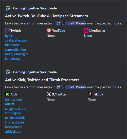 DeprecatedStreamer Bot (v1) - deprecated. This was an ambitious and early concept to enhance streamer discoverability across supported platforms. The bot watched for links in self-promo and updated an embed of recently live streamers, and it had a prototype featured streamer rotation that randomized featured profiles on set intervals.