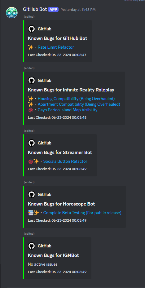 The GitHub Discord Bot grew out of frustration with limited webhook options. I wanted richer changelogs, better per-push change detail, and a way to track project status and issues inside Discord. Over time I built what I needed for multiple projects and discovered it was a powerful general utility. Early versions were limited by token handling and security constraints, and now with modern OAuth and Git authentication flows I am reworking the bot to use an authorization-based system so others can safely use it in their communities.